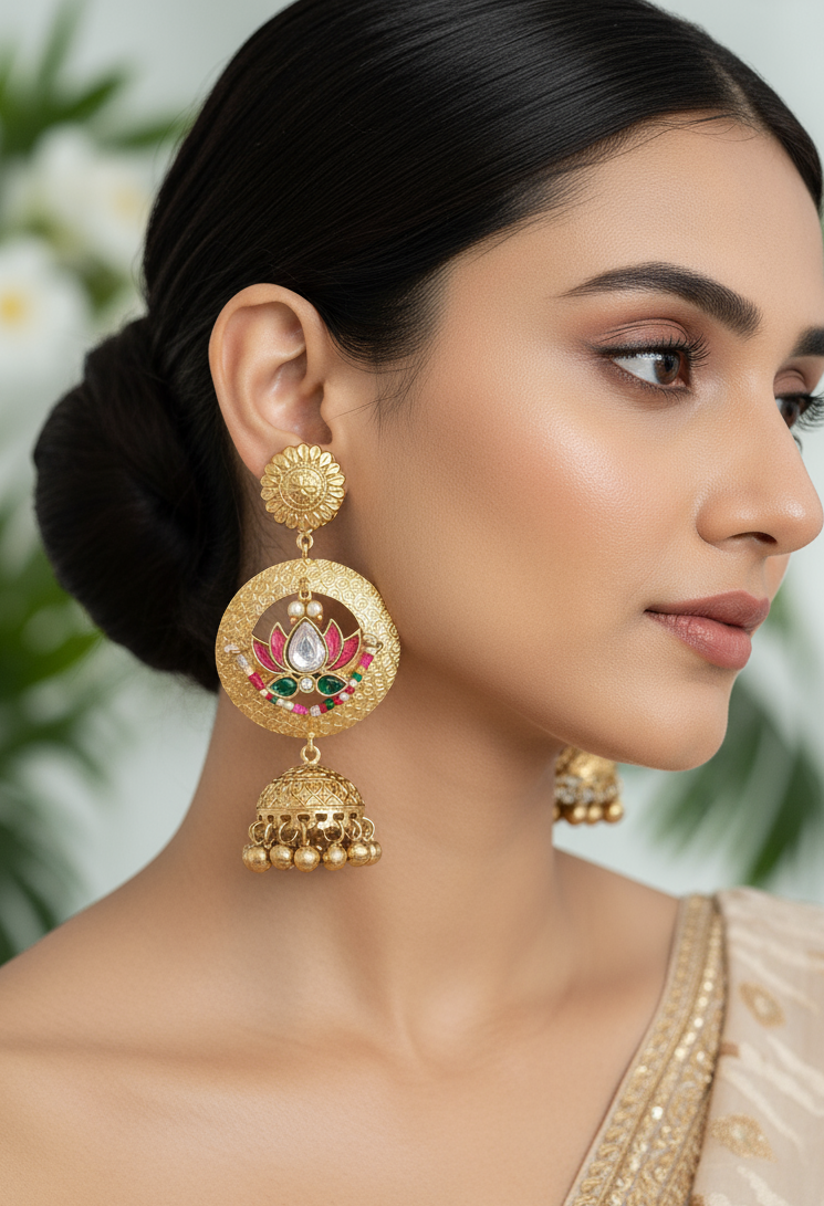 Earrings Design: Matching stud earrings with circular medallion design, green enamel center, colorful enamel dots, and textured detailing