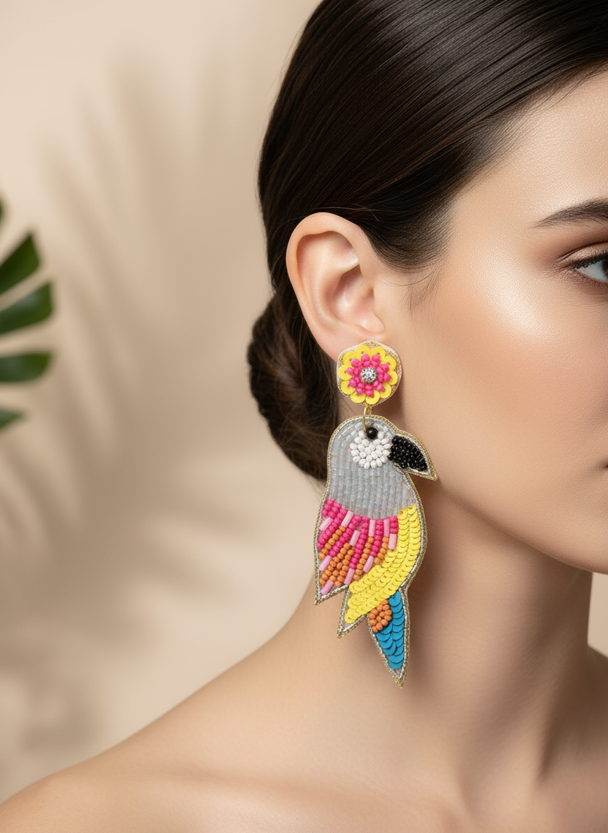 Design: Stylized parrot dangle earrings with detailed beadwork, sequin embellishments, and a floral topper