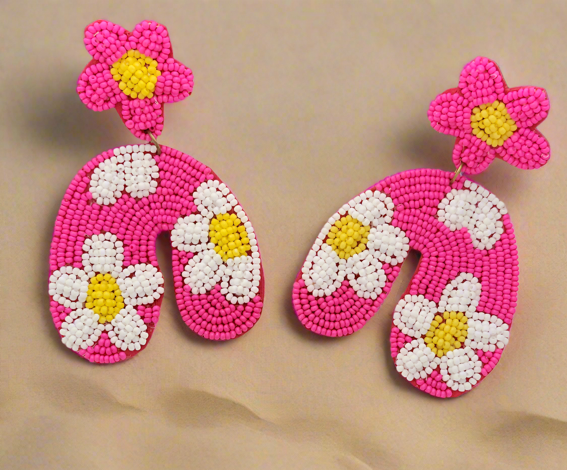 Bring a touch of retro charm and playful color to your look with these vibrant dangle earrings. Handcrafted with neon pink, white, and yellow beads, the cheerful floral design creates a groovy, eye-catching statement perfect for expressing your fun and colorful style.