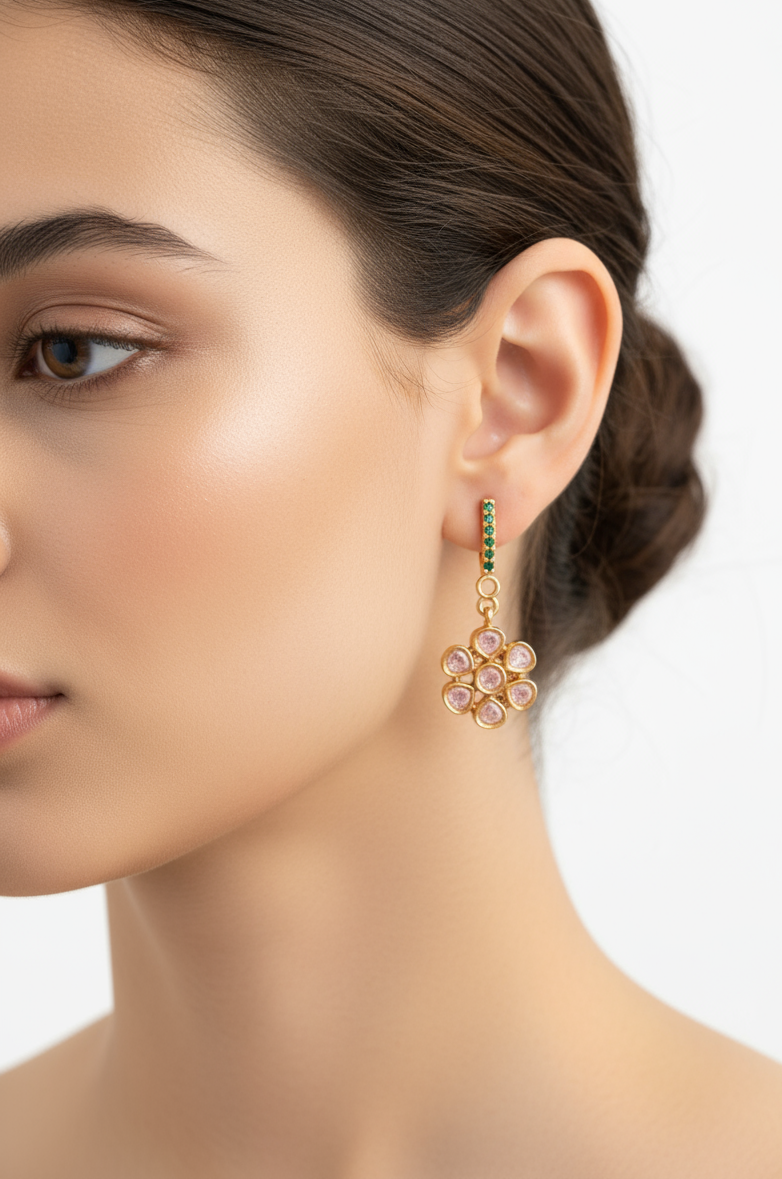 Floral Motifs: White Polki-style stone clusters matching the necklace design