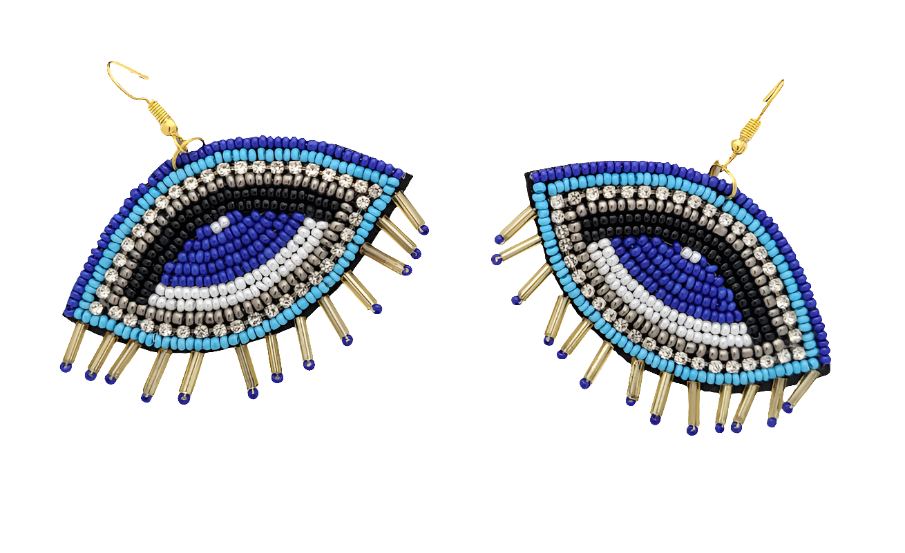 Design: Evil eye motif dangle earrings with detailed beadwork and subtle metal spikes