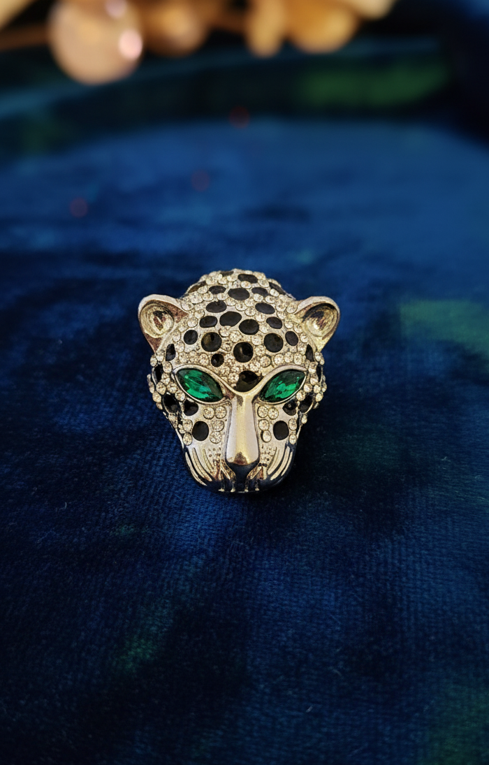 Exude sleek, untamed style with this striking statement pin. The animal's face is intricately detailed with contrasting black enamel spots and shimmering clear pave crystals set against a polished silver-tone base. Intense emerald-green crystal eyes add a captivating and luxurious finish. Perfect for adding a bold, modern edge to any lapel or coat.