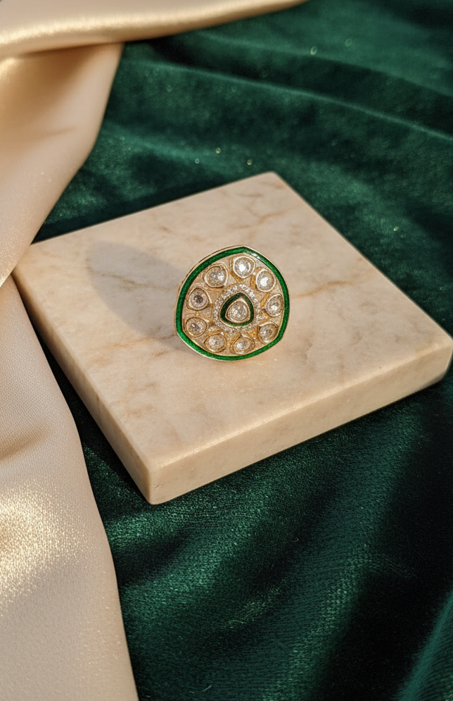 Inspired by traditional artistry, this statement piece is a true showstopper. The large surface is adorned with a cluster of bright imitation gems and striking green Meenakari (enamel) detailing. The triangular shape is modern, while the embellishment gives it an opulent, heirloom quality. Perfect for elevating any festive or evening look.