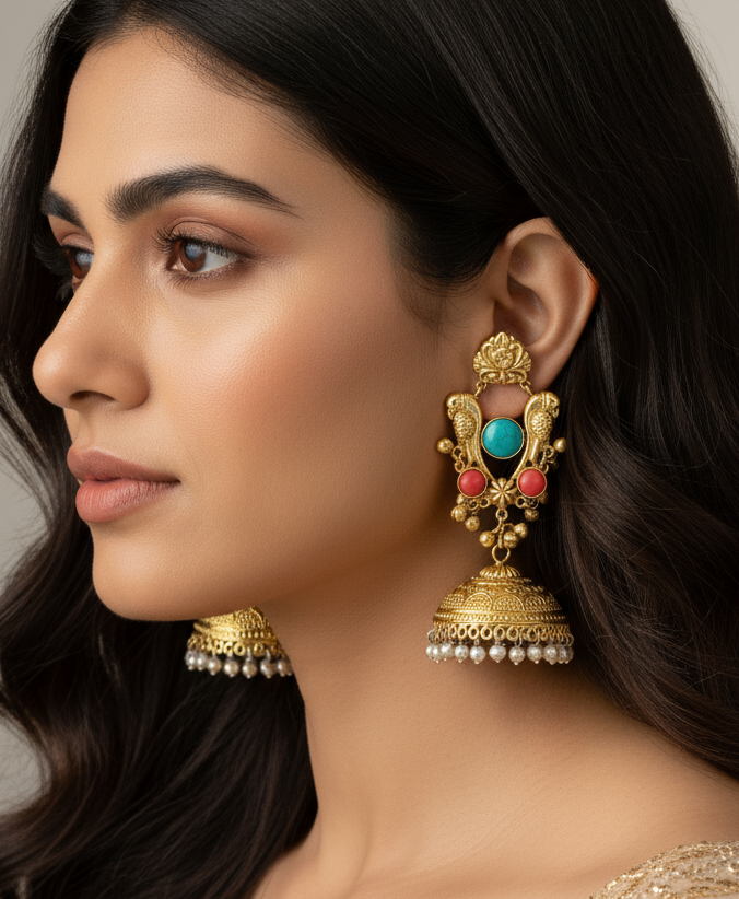• Design: Traditional jhumka earrings with parrot motifs, vibrant stones, and detailed craftsmanship