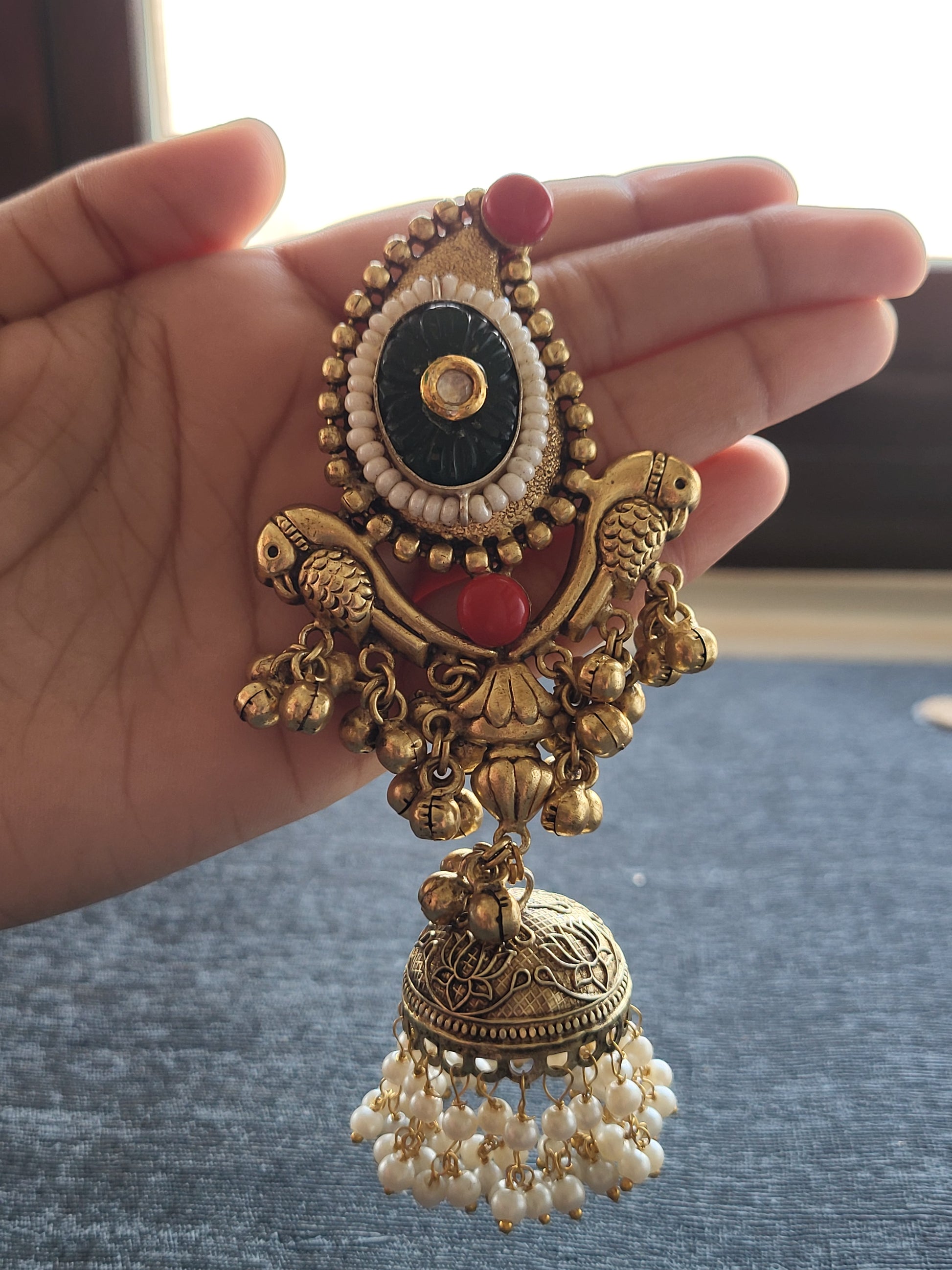 Celebrate traditional elegance with these exquisite jhumka earrings. Featuring parrot motifs, textured teardrop elements, peach and black accents, and delicate faux pearls, they exude timeless charm and are perfect for festive occasions, weddings, and cultural celebrations.