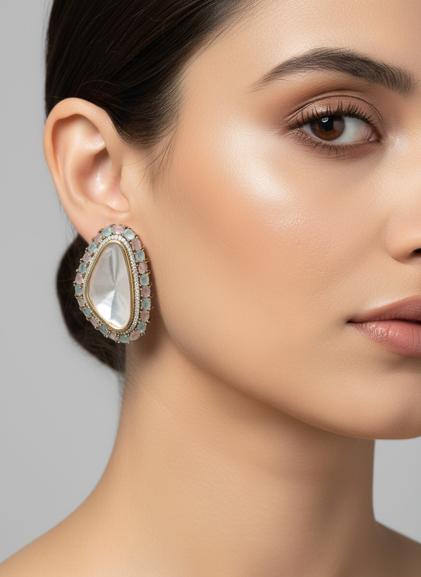 Elevate your look with these Modern Elegance stud earrings, a contemporary twist on classic Polki design. Featuring geometric shapes, delicate pastel stone accents, and subtle sparkle, these earrings are perfect for adding refined sophistication to any outfit.