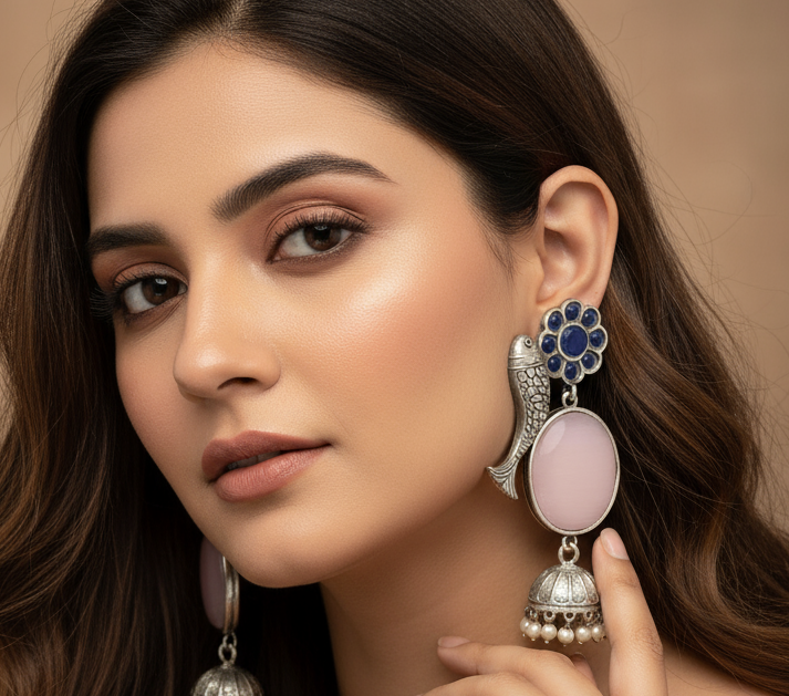 Add a touch of cultural richness to your look with these unique oxidized silver earrings. Featuring stylized fish motifs connected to a central glass stone and finished with traditional jhumka bells and delicate pearl drops, they blend tribal inspiration with Indian tradition. Perfect for festive occasions, cultural events, or as a standout accessory for everyday style.