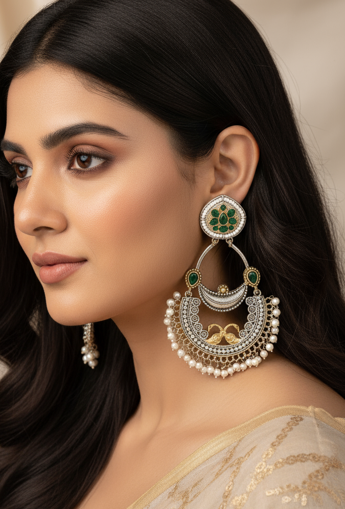 Elevate your ethnic wardrobe with these exquisite chandbali earrings. Featuring a two-tone silver and gold finish, delicate bird motifs, antique white stones, and pearl drops, they perfectly blend classic design with contemporary flair. The intricate patterns and detailed craftsmanship make these earrings a captivating statement piece for festive occasions, weddings, or cultural celebrations.