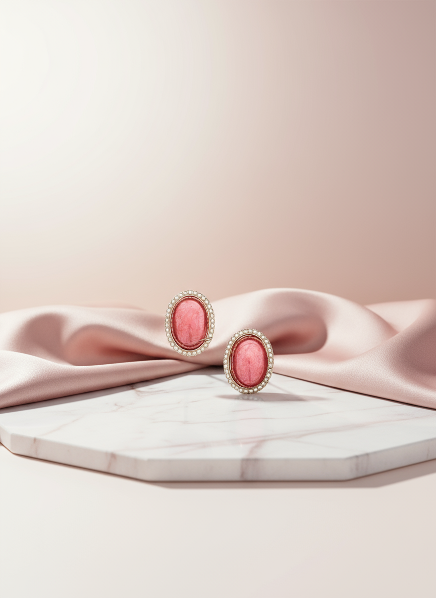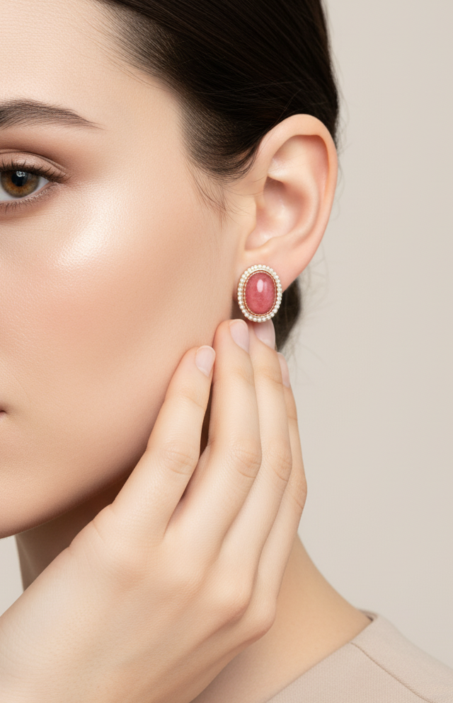 Design: Stud earrings with a central stone cabochon in a smooth bezel setting, encircled by a halo of small, round faux pearls